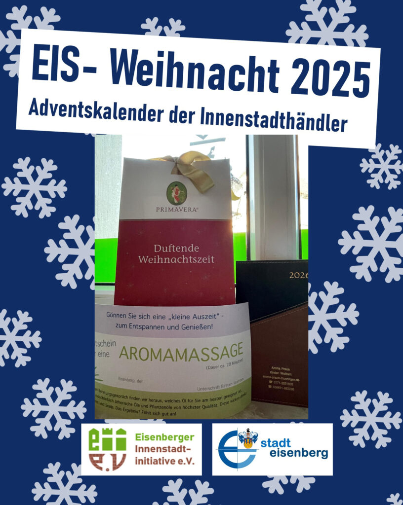 Öffnen Sie mit uns den EIS-Weihnacht-Adventskalender! Mit Ihrem Einkauf können Sie tolle Preise der Mitglieder und der Stadt Eisenberg gewinnen.