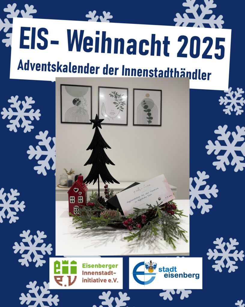 Öffnen Sie mit uns den EIS-Weihnacht-Adventskalender! Mit Ihrem Einkauf können Sie tolle Preise der Mitglieder und der Stadt Eisenberg gewinnen.