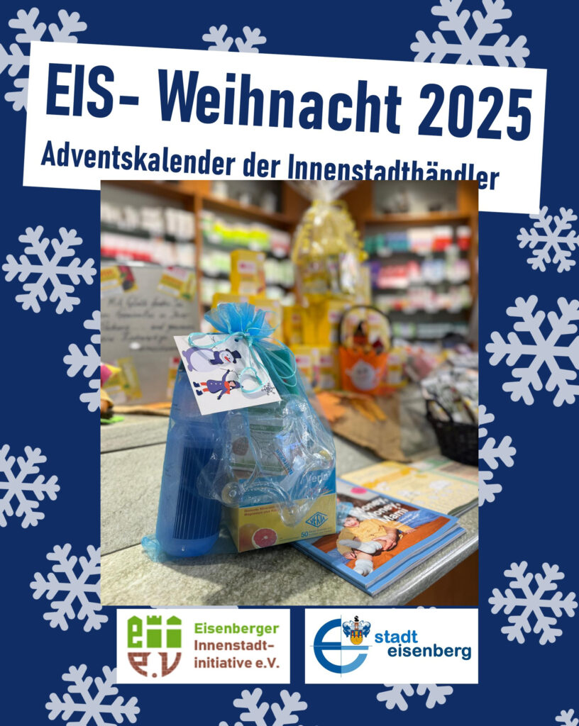 Öffnen Sie mit uns den EIS-Weihnacht-Adventskalender! Mit Ihrem Einkauf können Sie tolle Preise der Mitglieder und der Stadt Eisenberg gewinnen.