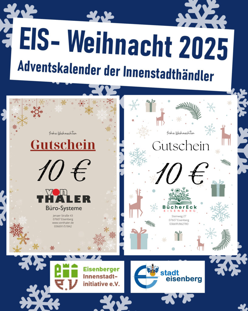 Öffnen Sie mit uns den EIS-Weihnacht-Adventskalender! Mit Ihrem Einkauf können Sie tolle Preise der Mitglieder und der Stadt Eisenberg gewinnen.