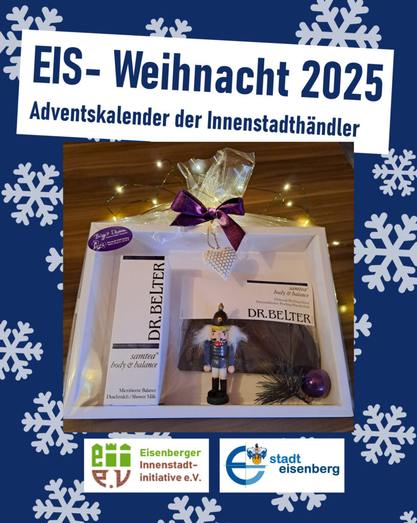 Öffnen Sie mit uns den EIS-Weihnacht-Adventskalender! Mit Ihrem Einkauf können Sie tolle Preise der Mitglieder und der Stadt Eisenberg gewinnen.